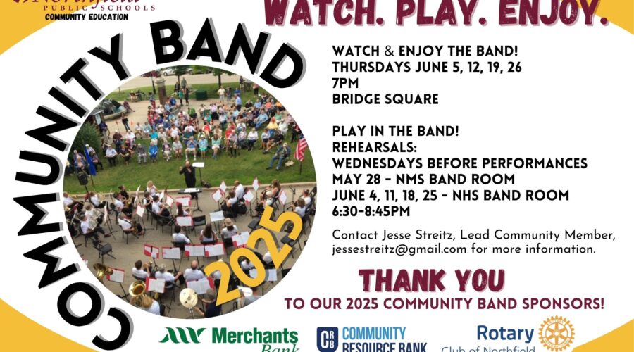 The Northfield Community Band presents a free concert series in downtown Northfield every June. The series consists of four Thursday evening concerts performed on Bridge Square. The band is comprised of high school and adult instrumentalists, willing to share their talents.