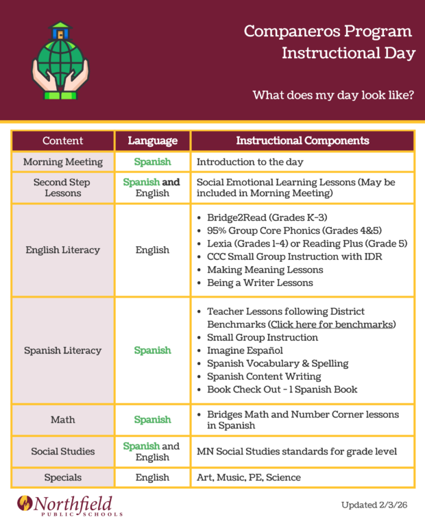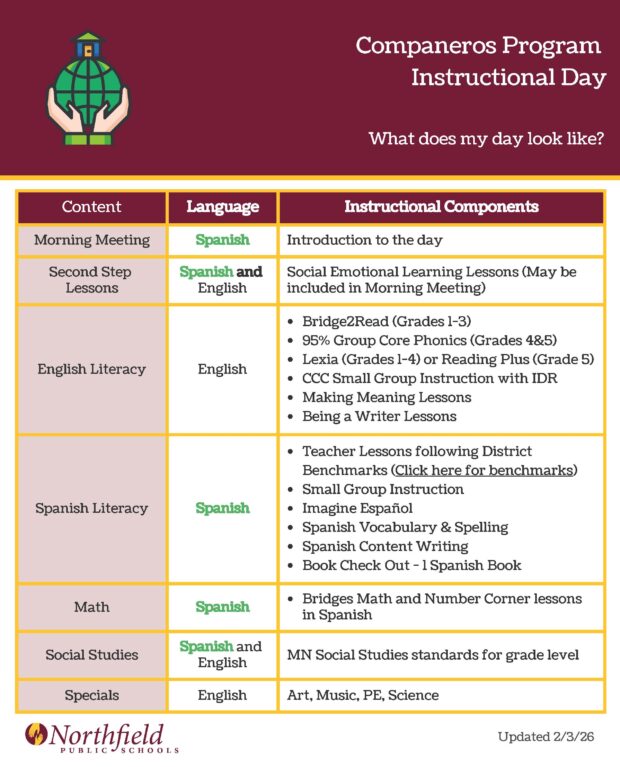 The Compañeros program is offered at all three elementary schools (Bridgewater, Greenvale Park and Spring Creek) in grades 1–5. It is a two-way immersion program where students learn to speak, read, write and listen in English and Spanish. Students in Compañeros spend half of their day receiving instruction in English and half their day receiving instruction in Spanish. In both Compañeros and English Only classrooms, teachers may incorporate two or three subjects into one lesson to complete integrated projects and activities. Compañeros and English Only teachers may collaborate during reading and math to meet the instructional needs of the students during a flexible group time.